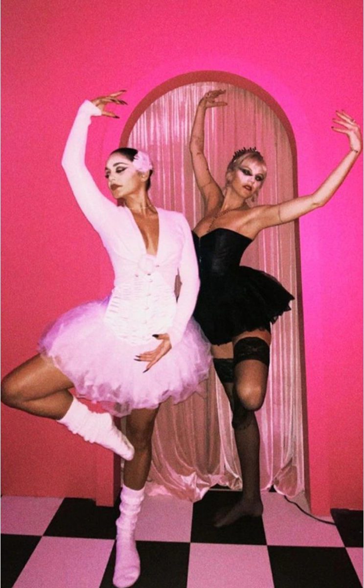 Στις φωτογραφίες του πάρτι που κοινοποιήθηκαν στο Instagram η ηθοποιός μεταμορφώθηκε στην κομψή Βασίλισσα του Λευκού Κύκνου φορώντας ένα λευκό αφράτο tutu. Η καλύτερη της φίλη GG MaGree πόζαρε μαζί της ως ο κακός Μαύρος Κύκνος, με έναν μαύρο στράπλες κορσέ, διακοσμημένο με tutu, δαντελωτές κάλτσες πάνω από το γόνατο και μαύρη τιάρα με καρφιά. Και οι δύο μπαλαρίνες πρόσθεσαν επίσης το δραματικό μακιγιάζ που έγινε διάσημο από την ταινία.