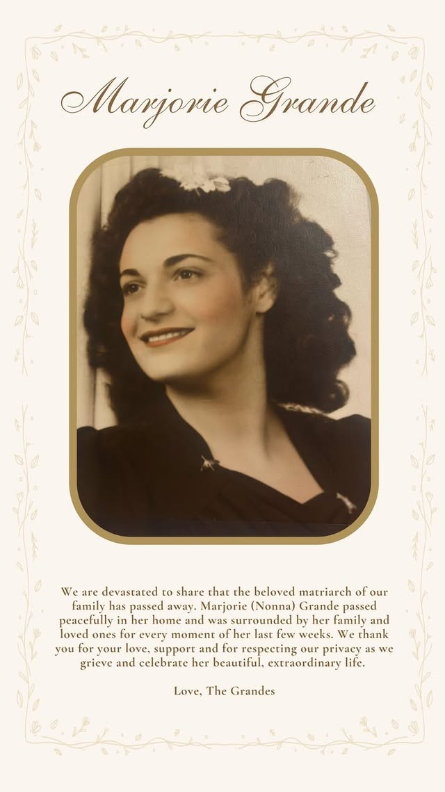 «Η Marjorie ‘Nonna’ Grande έφυγε ήρεμα στο σπίτι της, έχοντας δίπλα της την οικογένεια και τα αγαπημένα της πρόσωπα κάθε στιγμή των τελευταίων της εβδομάδων.