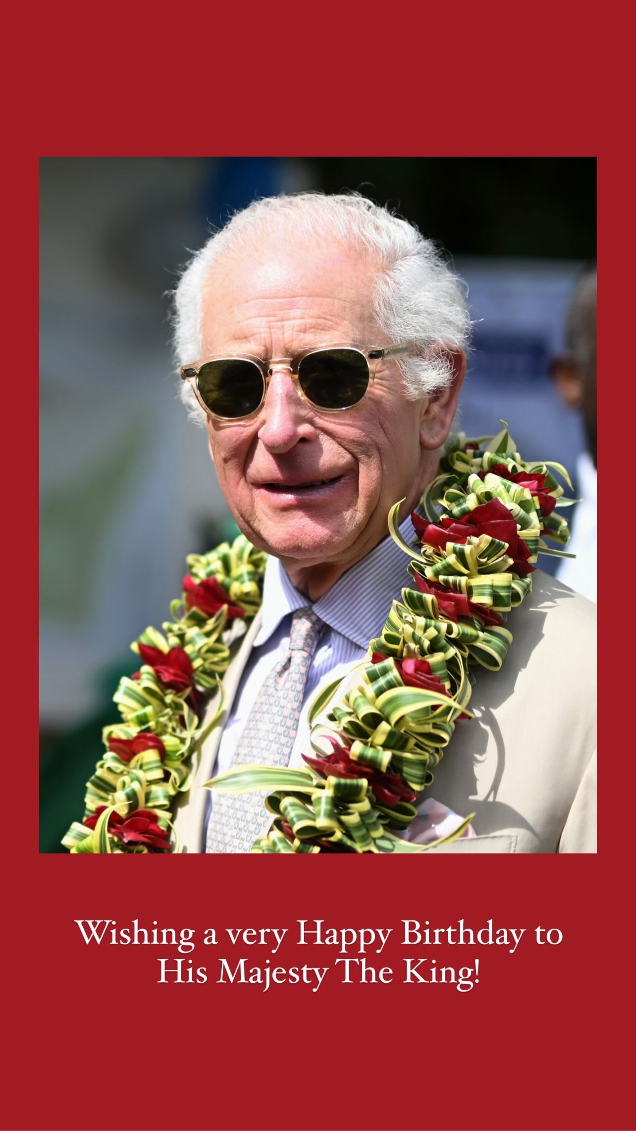 Ο William και η Kate ευχήθηκαν στον Κάρολο για την ξεχωριστή του ημέρα με ένα Insta Story, όπου ο βασιλιάς ποζάρει με λουλούδινο στεφάνι γύρω από τον λαιμό του. “Ευχόμαστε στον Μεγαλειότατο τον βασιλιά πολύ χαρούμενα γενέθλια” έγραψαν στη λεζάντα της φωτογραφίας.