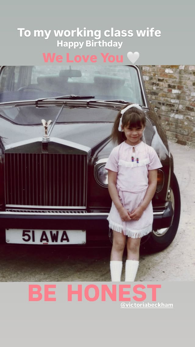 Ανέβασε, επίσης, σε Story διάφορες φωτογραφίες τους αλλά αυτή που ξεχώρισε είναι μία από την παιδική ηλικία της Victoria μπροστά από τη Rolls-Royce του πατέρα της τρολάροντας τη σύζυγό του. «Στη σύζυγό μου της μεσαίας τάξης. Χρόνια πολλά, σ’ αγαπάμε» έγραψε αναφερόμενος σε στιγμιότυπο από το ντοκιμαντέρ του όταν η Victoria είπε ότι ήταν από μεσοαστική οικογένεια, αλλά ο David την εγκάλεσε θυμίζοντάς της ότι ο πατέρας της την πήγαινε στο σχολείο με Rolls-Royce.