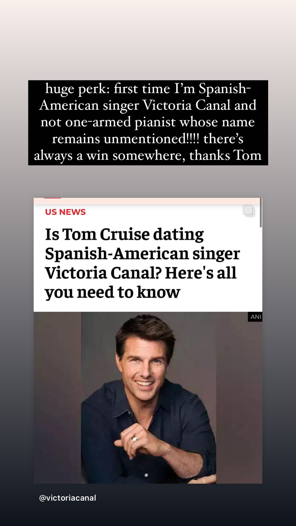 Ωστόσο η Victoria Canal προχώρησε σε μια ανάρτηση στον προσωπικό της λογαριασμό στο Instagram, θέλοντας να ξεκαθαρίσει την κατάσταση και να επισημάνει, ότι ο Tom Cruise είναι για εκείνη ένας καλός φίλος και μέντορας και τίποτα παραπάνω.