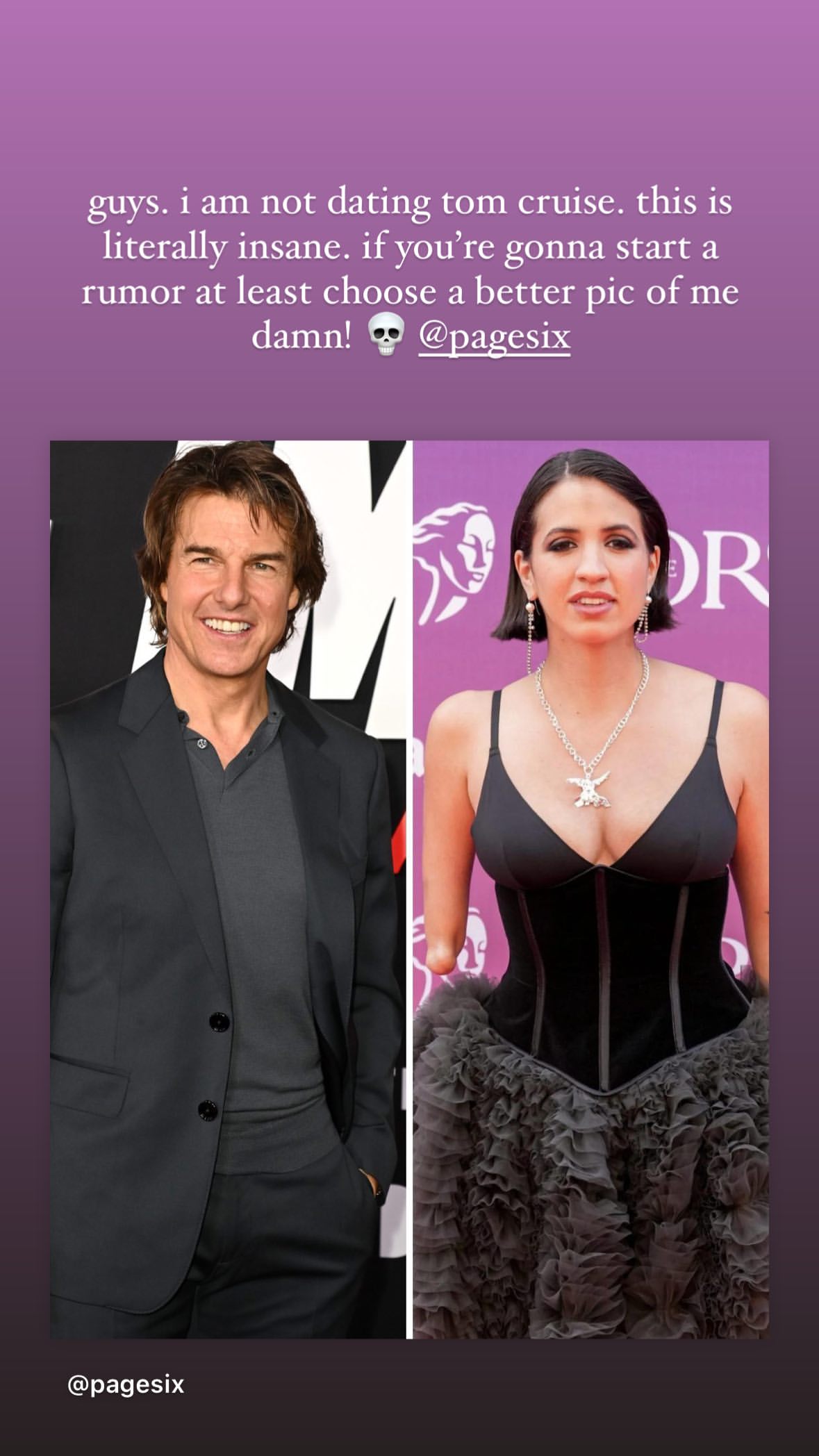 Συγκεκριμένα, η τραγουδίστρια δημοσίευσε μία φωτογραφία, που τη δείχνει να γελάει και να κρύβει με το χέρι της το χαμόγελό της. Στη λεζάντα έγραψε: « Παιδιά, αυτό που συμβαίνει είναι κυριολεκτικά τρελό, αλλά προφανώς τα ταμπλόιντ πιστεύουν ότι βγαίνω με τον Tom Cruise. Έχω πεθάνει. Ας το σταματήσουμε αυτό. Λυπάμαι που σας στεναχωρώ, αλλά δεν βγαίνω με αυτόν τον άντρα, αν και είναι ένας υπέροχος άνθρωπος και καλλιτέχνης. Ποτέ δεν πίστευα ότι θα έπρεπε να το ξεκαθαρίσω αυτό δυνατά στη ζωή μου. Με κάθε σοβαρότητα παιδιά, ο Τom δεν είναι παρά ένας σεβαστός και ενθαρρυντικός άνθρωπος και μέντορας, όπως ο Chris Martin, ο μπαμπάς μου, οι δάσκαλοι μουσικής μου και άλλοι σοφοί άνθρωποι που μου έμαθαν πολλά για τη ζωή. Μαθαίνεις πολλά αν είσαι ανοιχτός στο να σου φέρνει η ζωή αυτούς τους δασκάλους.»