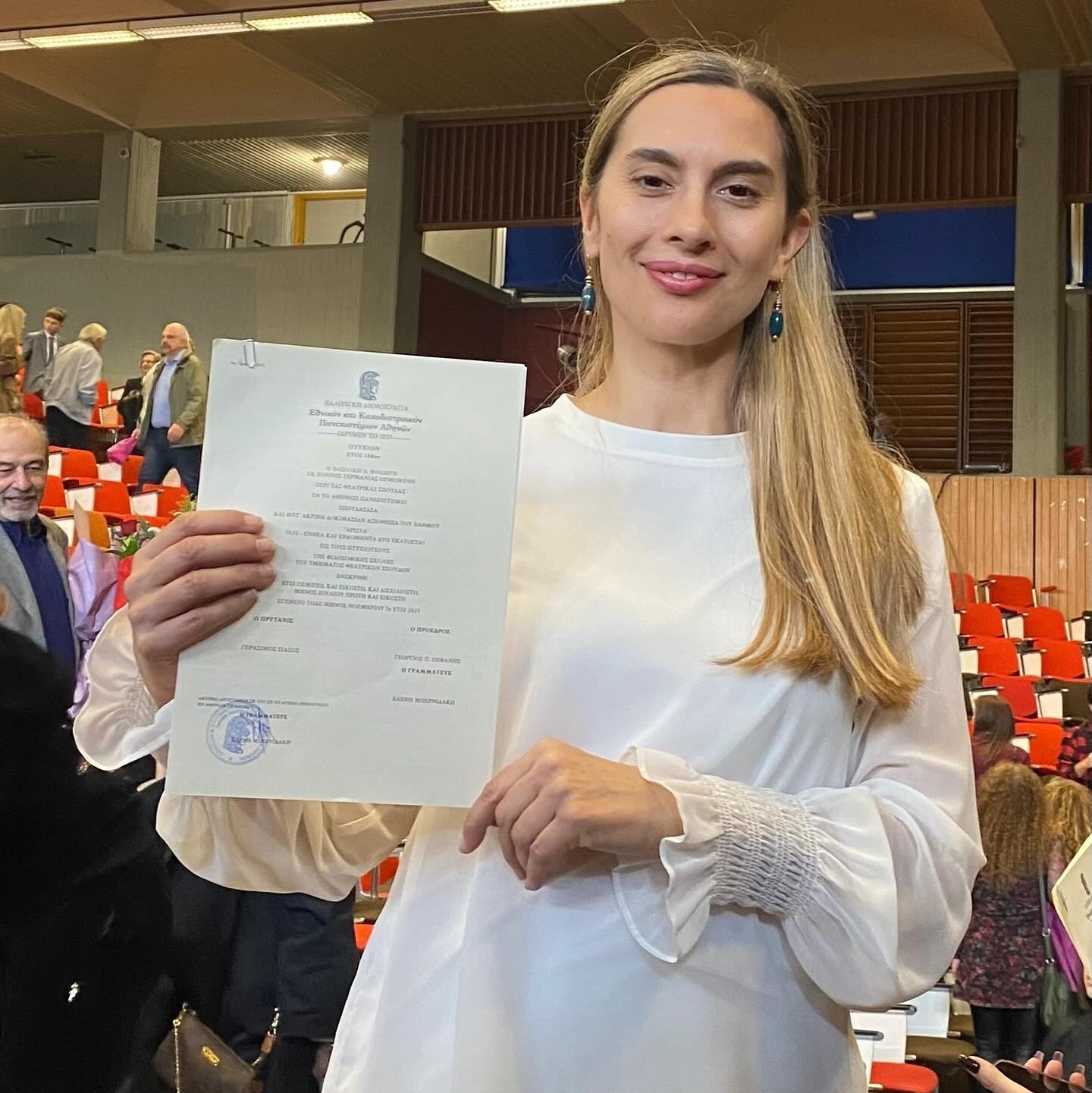 Η Βίκυ Βολιώτη έγραψε στη λεζάντα της ανάρτησής της, ότι επιτέλους κατάφερε να πάρει το πτυχίο, που είχε υποσχεθεί στον πατέρα της, λίγο πριν εκείνος φύγει από τη ζωή. Επίσης πρόσθεσε, ότι στην ορκωμοσία τη συνόδευσε η κόρη της, Άννα, γεγονός που έκανε τη χαρά της ακόμα μεγαλύτερη. Τέλος η ηθοποιός θέλησε να ευχαριστήσει έναν έναν τους συμφοιτητές της.