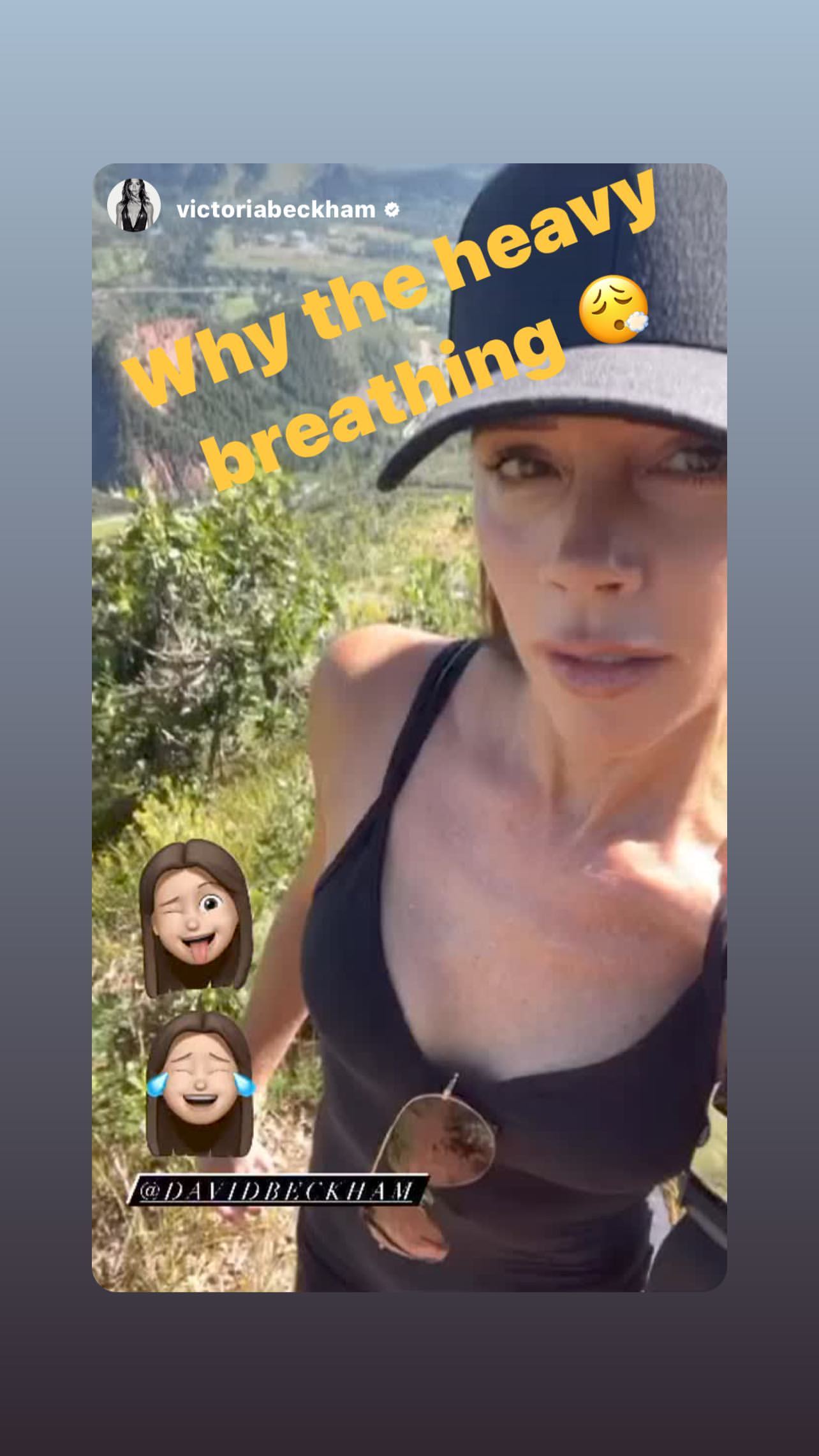 Η Victoria παίρνει βαθιές ανάσες και δυσκολεύεται να αναπνεύσει από την κούραση, ενώ τονίζει ότι η πεζοπορία σε τόσο μεγάλο υψόμετρο είναι μια μεγάλη πρόκληση. “Είμαι εδώ David!” έγραψε στη λεζάντα.