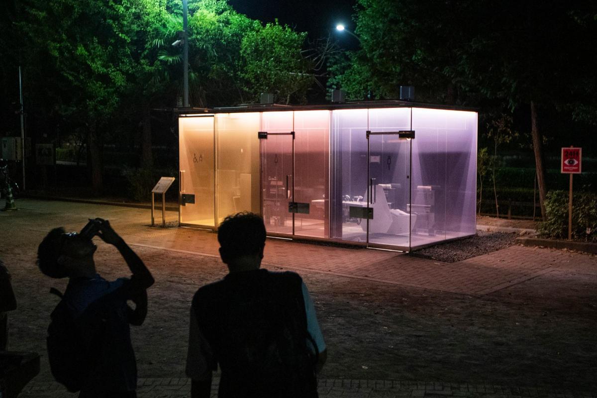 A man leaves the public toilet which was designed by architect Tadao Ando in Tokyo