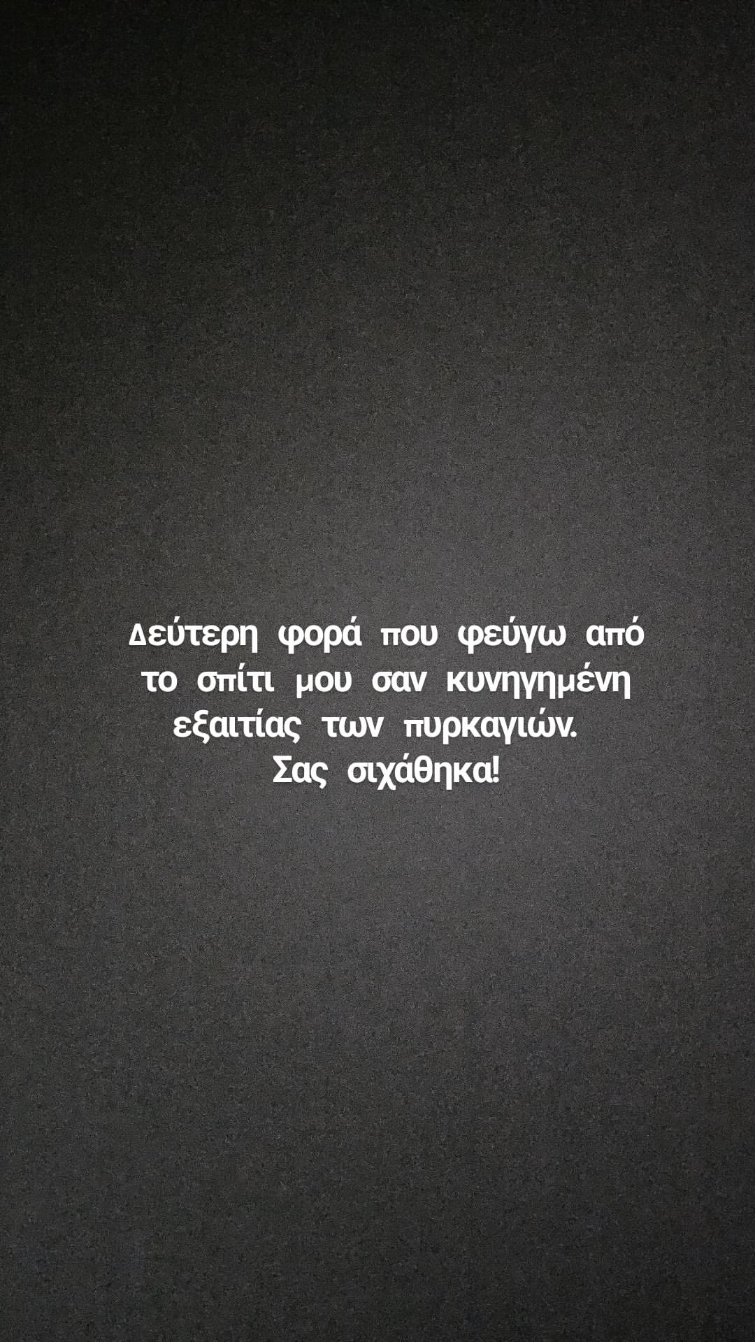 Η Μαντώ Γαστεράτου ξέσπασε μέσα από μια ανάρτησή της στο Instagram, γράφοντας: «Δεύτερη φορά που φεύγω από το σπίτι μου σαν κυνηγημένη εξαιτίας των πυρκαγιών. Σας σιχάθηκα».