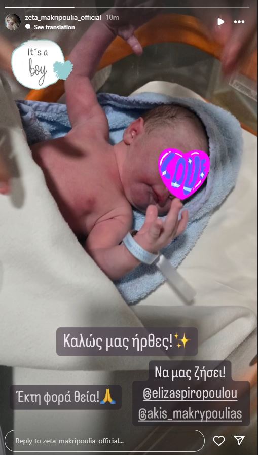 Συγκεκριμένα η Ζέτα Μακρυπούλια ανέβασε μια φωτογραφία με το νεογέννητο μωράκι, που είναι αγόρι. “”Kαλώς μας ήρθες! Έκτη φορά θεία, να μας ζήσει” κάνοντας ονομαστική αναφορά στον αδερφό της, Άκη Μακρυπούλια, αλλά και στην σύζυγό του Ελίζα που καλωσόρισαν το νέο μέλος της οικογένειάς τους.