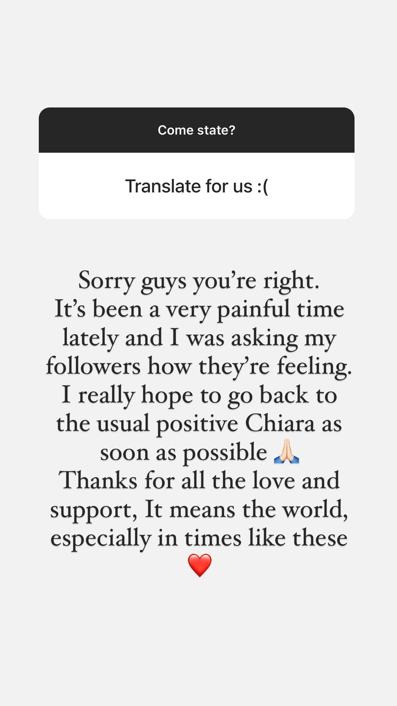 “Με συγχωρείτε, έχετε δίκιο. Αυτή η περίοδος είναι πολύ δύσκολη για μένα και ήθελα να ρωτήσω τους ακόλουθούς μου για το πώς νιώθουν. Εύχομαι σύντομα να καταφέρω να γίνω ξανά η θετική “Chiara” που όλοι ξέρετε. Σας ευχαριστώ για όλη την αγάπη και τη στήριξη. Σημαίνει τόσα πολλά για μένα, κυρίως σε περιόδους σαν αυτή” έγραψε η Ferragni.