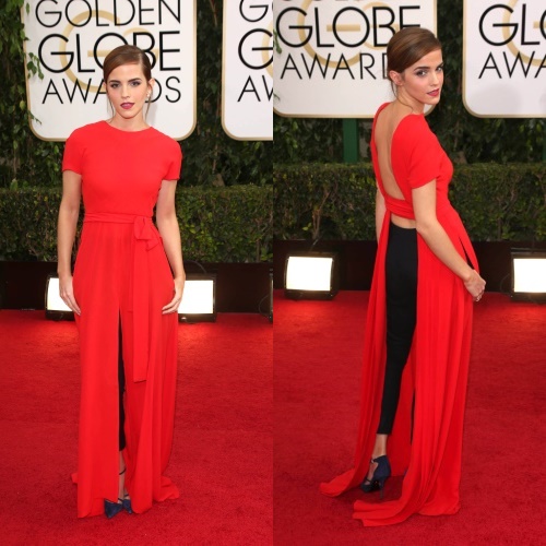 Η Emma Watson ήταν η μοναδική που ρίσκαρε, τόλμησε και δεν επέλεξε μία μακριά τουαλέτα που παίζοντας με τη γραμμή της και τα χρώματα της είτε θα ξεχώριζε είτε θα περνούσε αδιάφορη ως παρουσία στο κόκκινο χαλί. Η νεαρή ηθοποιός φόρεσε μακριά δημιουργία, υψηλής ραπτικής του οίκου Christian Dior, σε κόκκινη απόχρωση που από μπροστά σε τίποτα δεν προδίδει πως πρόκειται για μακρύ τοπ, με αποκαλυπτική πλάτη που η ηθοποιός φόρεσε με μαύρο, cigarette παντελόνι και μπλε, σουέτ πέδιλα του οίκου Roger Vivier.