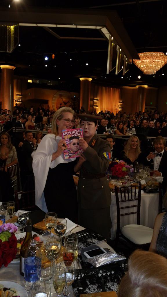 Η Tina Fey και η Amy Poehler, οι δυο παρουσιάστριες της μεγάλης βραδιάς, έδωσαν ρέστα, κάνοντας όλους τους εκπροσώπους της showbiz να γελούν ασταμάτητα με τις αστείες ατάκες τους –αναφέρθηκαν μέχρι και στον Bill Cosby και στις κατηγορίες που εκείνος αντιμετωπίζει για σεξουαλική κακοποίηση δεκάδων γυναικών. Δική τους ιδέα ήταν η εκπροσώπηση από τη Βόρεια Κορέα, με μια δημοσιογράφο ντυμένη με την στρατιωτική στολή της χώρας της, η οποία ήθελε να βγάλει μια φωτογραφία με την Meryl Streep. Με τον τρόπο αυτό διακωμώδησαν το τεράστιο θέμα που προέκυψε με την ταινία «Interview», η οποία αναφέρεται στον Κιμ Γιονγκ Ουν. Δείτε το ξεκαρδιστικό απόσπασμα, στο οποίο ο Benedict Cumberbatch κάνει ένα υπέροχο photobomb.