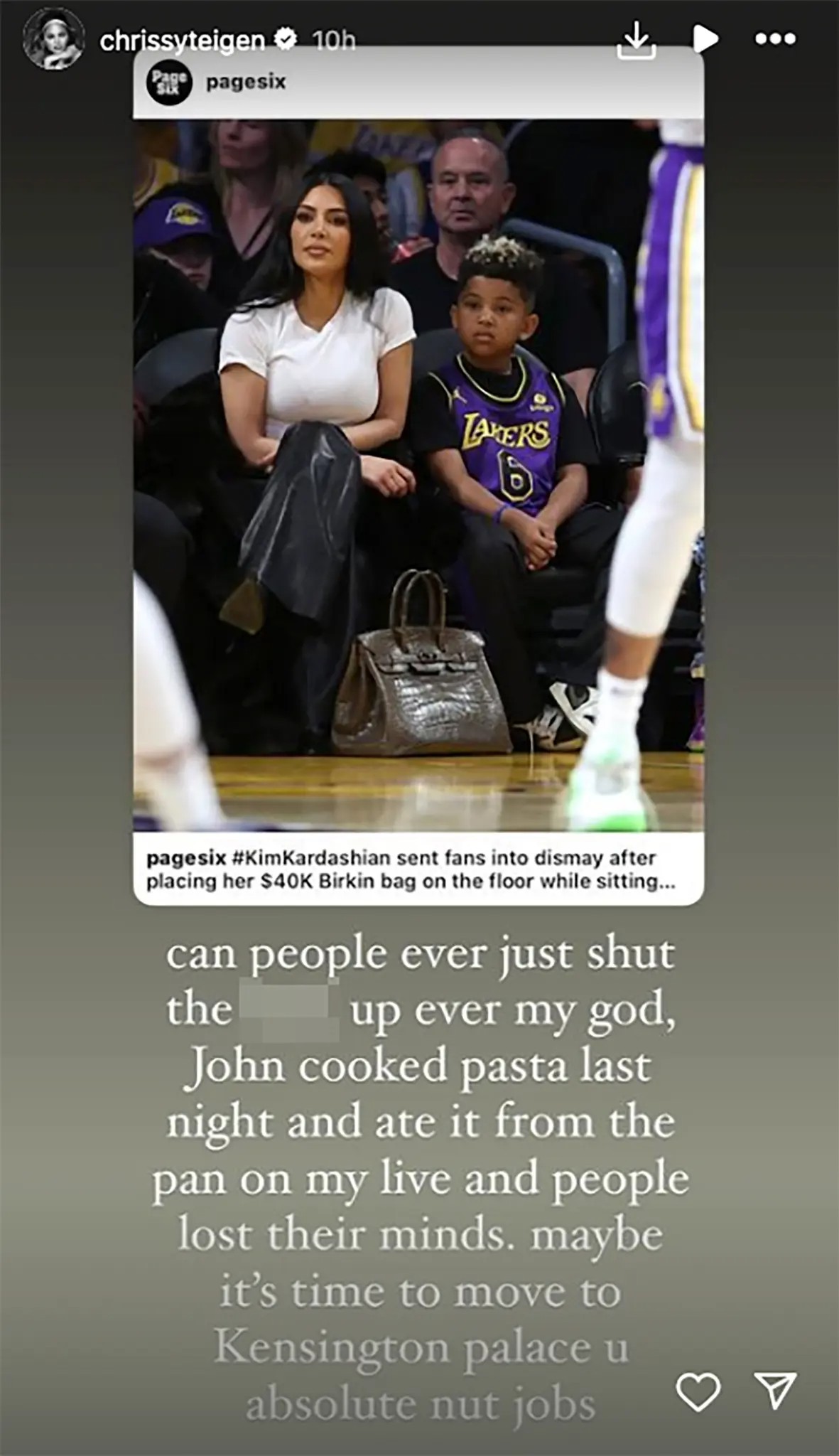 «Μπορεί ο κόσμος να βγάλει ποτέ το σκασμό ποτέ Θεέ μου; Ο John μαγείρεψε μακαρόνια χθες το βράδυ. Επειδή τα έφαγε από το τηγάνι στο live μου, ο κόσμος τρελάθηκε» έγραψε. Όλα αυτά μέσα από ένα Instagram story. Φυσικά όταν λέει «John», αναφέρεται στον σύζυγό της, John Legend. «Ίσως ήρθε η ώρα να μετακομίσετε στο παλάτι του Kensington. Είστε απολύτως τρελοί», δήλωσε.
