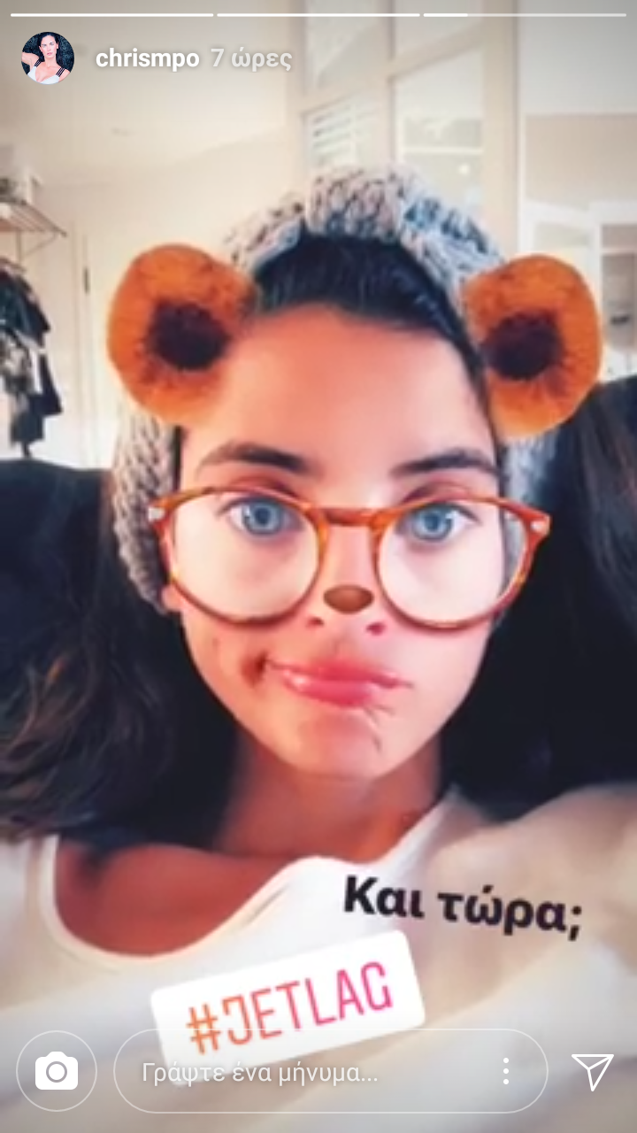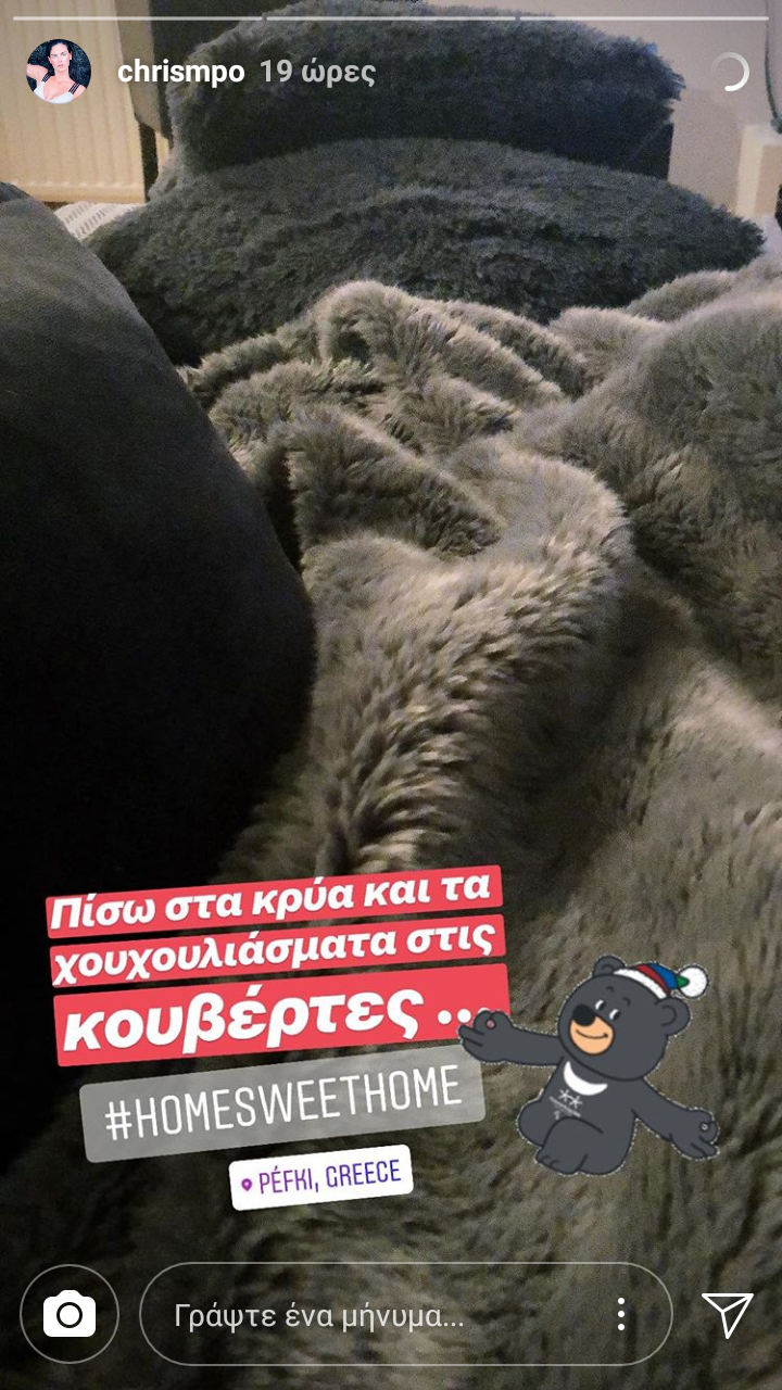 Καθώς η πτήση της προσγειώθηκε μόλις χθες, η Χριστίνα Μπόμπα «υποφέρει» ακόμα από jet lag, λόγω της αλλαγής στη ζώνη ώρας, οπότε το πρώτο της βράδυ στην Αθήνα το πέρασε ξάγρυπνη, χαλαρώνοντας στο σπίτι της και αναρτώντας μερικά stories στον προσωπικό της λογαριασμό στο instagram. «Πίσω στα κρύα και στα χουχουλιάσματα στις κουβέρτες», έγραψε στη λεζάντα μίας από τις φωτογραφίες.
