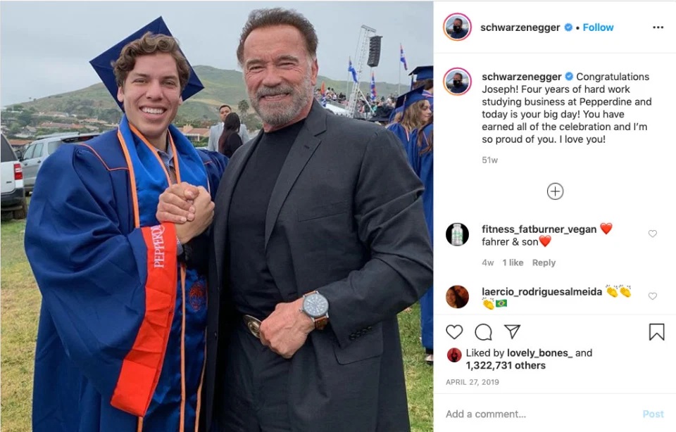 Το πέμπτο του παιδί και τρίτο του αγόρι είναι το νόθο παιδί με μητέρα την Mildred Baena που ήταν και η πρώην οικονόμος του όσο ήταν παντρεμένος με την Maria Shriver. Το σκάνδαλο του 2011 ήταν μεγάλο, έφτασε όμως το σήμερα και ο πατέρας που μοιάζει σαν μια σταγόνα νερό με τον γιο του Joseph έγραψε στο instagram του, πόσο περήφανος νιώθει για την επιτυχία του!