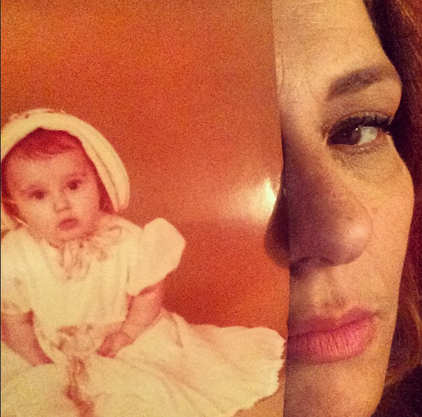 Σήμερα λοιπόν ανάρτησε στον προσωπικό της λογαριασμό στο Instagram, μία selfie στην οποία κρύβει το μισό της πρόσωπο με μια φωτογραφία από τότε που ήταν πολύ μικρή. Στην εν λόγω φωτογραφία λοιπόν φοράει ένα λευκό φόρεμα και ένα λευκό καπέλο με ροζ κορδέλες.