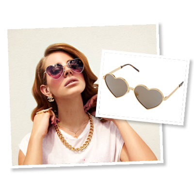 Όπως καταλαβαίνετε, αν και έχει περάσει αρκετός καιρός από τότε που είδαμε αυτή τη φωτογραφία της ψάχνουμε να βρούμε ένα ζευγάρι γυαλιά ηλίου που μοιάζουν όσο το δυνατόν περισσότερο με αυτά της Lana και επιτέλους τα βρήκαμε. Πρόκειται για τα γυαλιά σε σχήμα καρδιάς της εταιρείας Wildfox τα οποία βέβαια δεν έχουν τους ροζ φακούς που έχουν αυτά που φοράει η καλλιτέχνης, αλλά πιο σκούρους κατάλληλους για το ελληνικό καλοκαίρι και τον ήλιο που καίει. Έχουν χρυσό, μεταλλικό σκελετό, ιδανικό για να χαρίσει μια πιο glam νότα στην εμφάνισή σας.