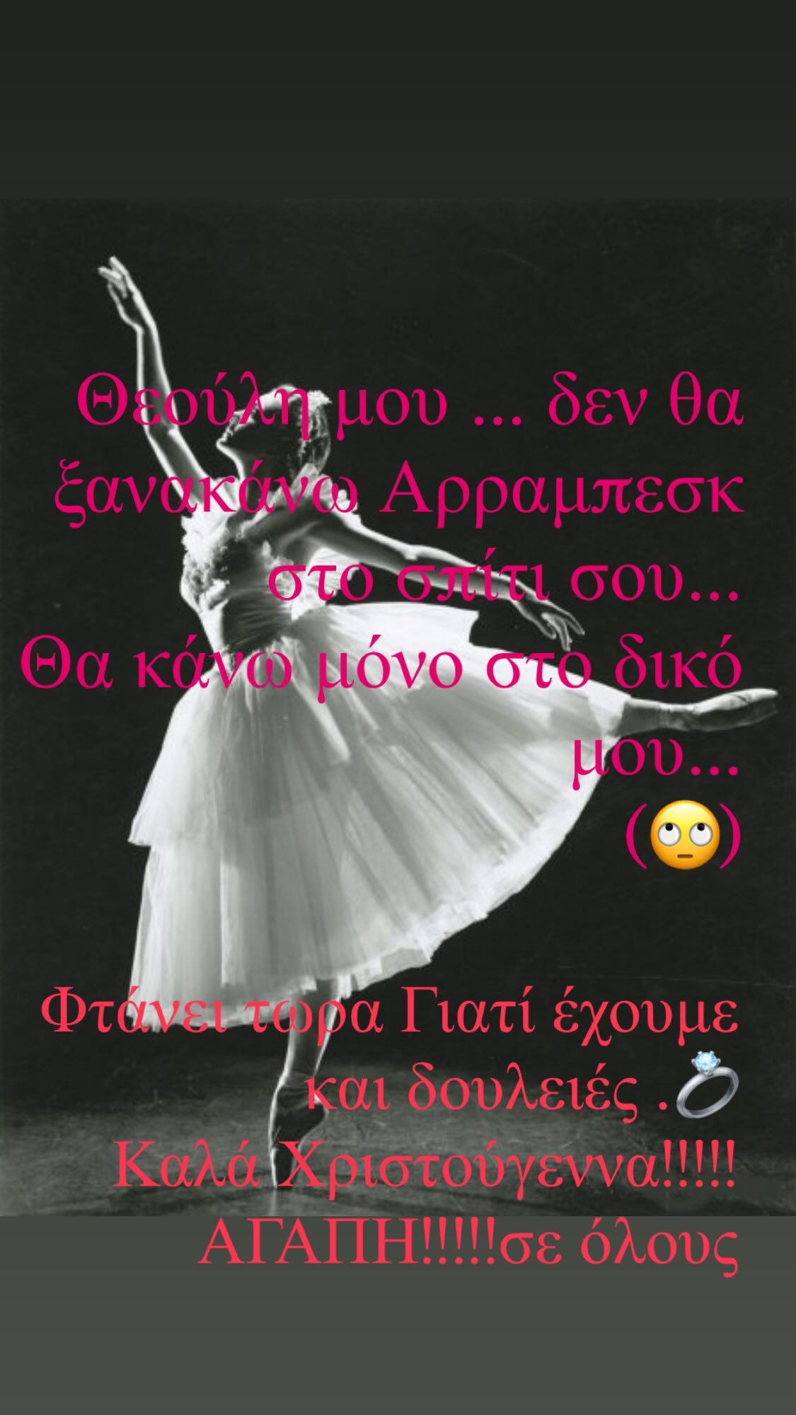 Η ίδια μάλιστα, ανέβασε και ένα χιουμοριστικό story στον προσωπικό της λογαριασμό στο Instagram και έγραψε:”Θεούλη μου, δεν θα ξανακάνω Αρραμπέσκ(χορευτική κίνηση) στο σπίτι σου. Θα κάνω μόνο στο δικό μου”.
