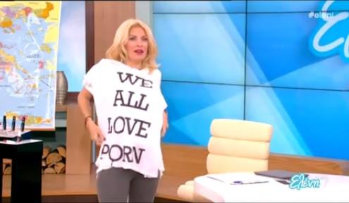 Η νέα εβδομάδα ξεκίνησε με ιδιαίτερα κέφια, απορίες και τεχνικά προβήματα για την Ελένη Μενεγάκη στην εκπομπή της. Η παρουσιάστρια έφτασε με καθυστέρηση στο πλατό της εκπομπής, μετά την -επίσης- καθυστερημένη είσοδο του Θοδωρή Κουτσογιαννόπουλου. Η κουβέντα ξεκίνησε και η «ωραία Ελένη» περιέγραψε στους συνεργάτες της, ότι αγόρασε μια «πρόστυχη» μπλούζα που δεν γνώριζε τι έγραφε.