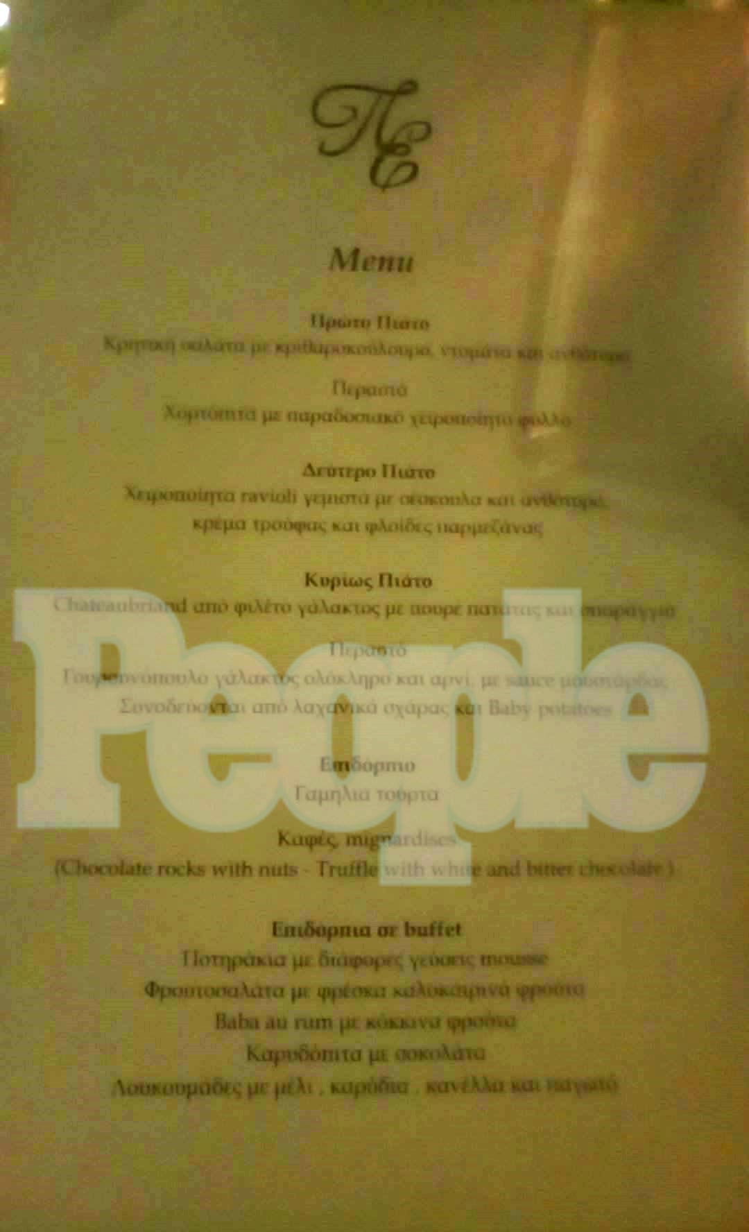 Μεταξύ άλλων, το μενού της δεξίωσης περιελάμβανε κρητική σαλάτα, χορτόπιτα με παραδοσιακό χειροποίητο φύλο, χειροποίητα ravioli με κρέμα τρούφας και φολίδες παρμεζάνας, chateaubriand από φιλέτο γάλακτος με πουρέ πατάτας και σπαράγγια, γουρουνόπουλο γάλακτος και αρνί με sauce μουστάρδας και λαχανικά σχάρας, ενώ για επιδόρπιο υπήρχε ποικιλία γλυκισμάτων, όπως baba au rum, καρυδόπιτα και λουκουμάδες, καθώς και φρουτοσαλάτα.