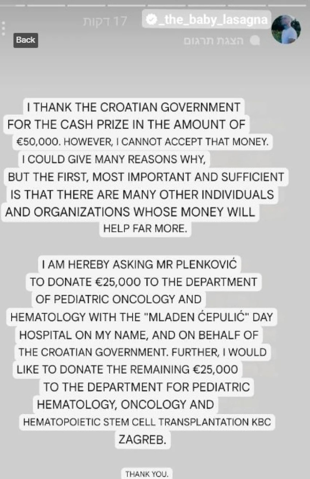 Τη δεύτερη θέση στην Eurovision κατάφερε να κερδίσει η Κροατία. Μάλιστα, ο εκπρόσωπός της Κροατίας, ο “Baby Lasagna”, απέσπασε πολύ θετικά σχόλια. Ο τραγουδιστής προέβη σε μια συγκινητική κίνηση, όταν η Κροατική κυβέρνηση επικοινώνησε μαζί του για να του δώσει το χρηματικό βραβείο ύψους 50,000 για τη συμμετοχή του στο διαγωνισμό. Ο Baby Lasagna αποκάλυψε πώς δεν θα δεχθεί το χρηματικό βραβείο. Ωστόσο, όπως είπε θα ήθελε αυτά τα χρήματα να γίνουν δωρεές σε ανθρώπους πού το έχουν ανάγκη.