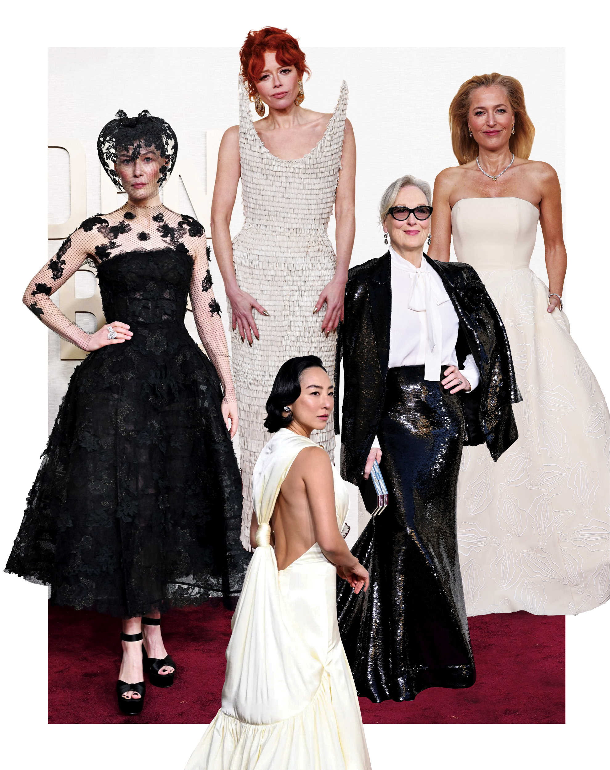 Υπήρχαν κι άλλες που, παρότι δεν βραβεύτηκαν, ξεχώρισαν στα δικά μας μάτια για τις ενδυματολογικές επιλογές τους. Όπως η Gillian Anderson, που φόρεσε μια τουαλέτα διά χειρός Gabriela Hearst με κεντημένα αιδοία, ταιριαστή με τον ρόλο της στο Sex Education. Ή όπως η Rosamund Pike, η πρωταγωνίστρια του επικού φιλμ Saltburn, η οποία φόρεσε ένα βέλο για να καλύψει το σημάδι που της άφησε μια πτώση στο σκι. Όπως και να έχει, όλες τους ήταν υπέροχες!