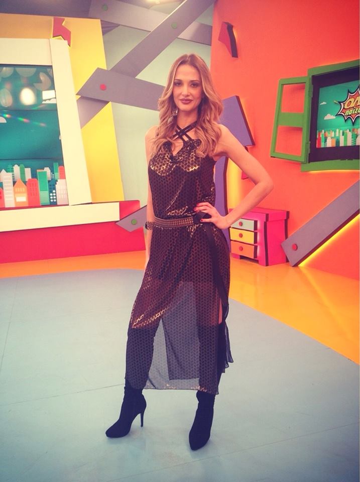 Ακόμα ένα σύνολο που ζηλέψαμε ήταν το χθεσινό. Η παρουσιάστρια λοιπόν επέλεξε ένα see through φόρεμα το οποίο έδενε στον λαιμό της και φέρει την υπογραφή της εταιρείας The KNLs. Μπορείτε μάλιστα να το βρείτε στο 21 Fashion Market με έκπτωση 50%. Το συνδύασε με δερμάτινη ζώνη με τρουκς και knee high, ψηλοτάκουνες μπότες που ταίριαζαν απόλυτα με όλο το look.