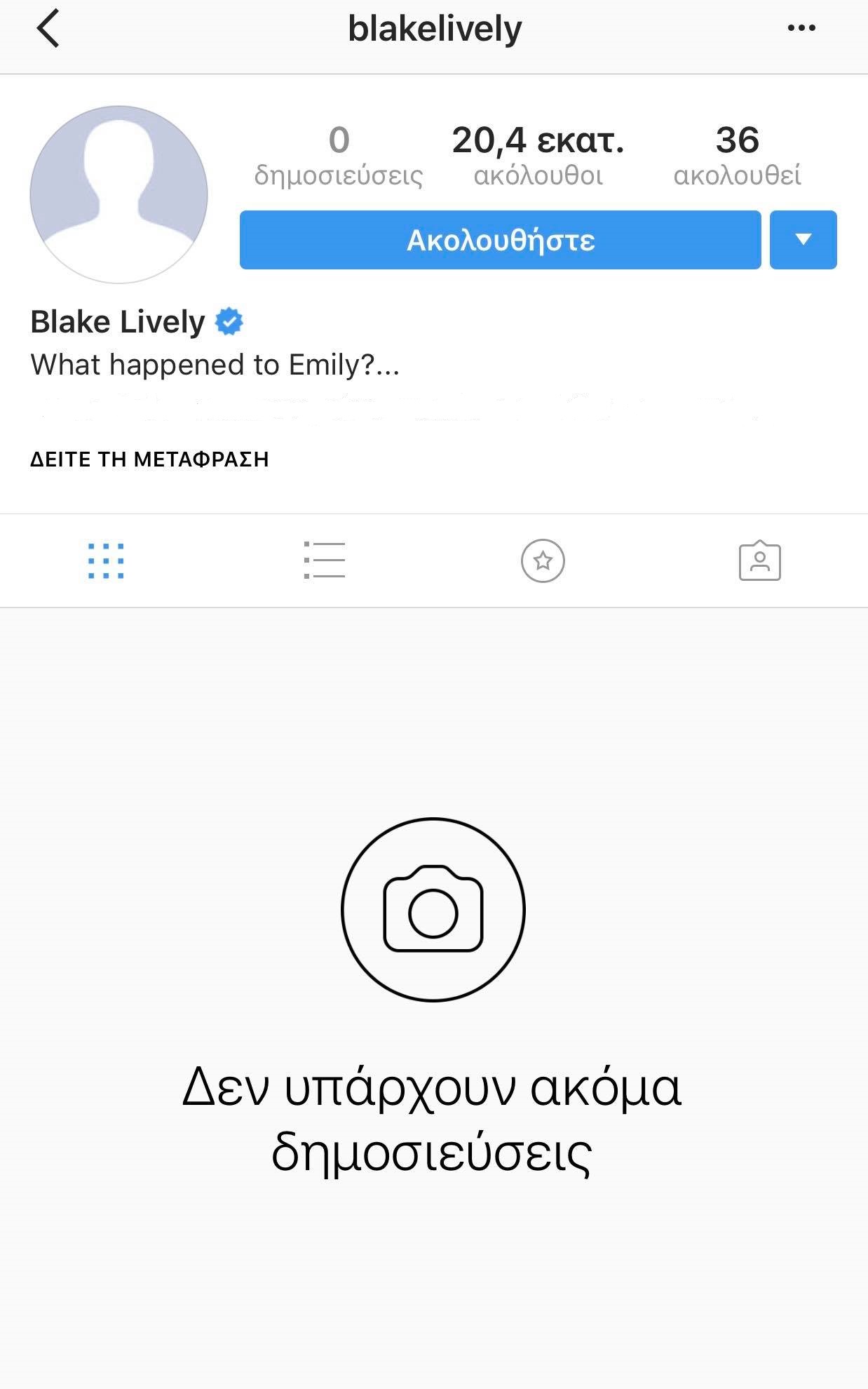 Η Blake Lively διέγραψε όλες τις φωτογραφίες της από τον προσωπικό της λογαριασμό στο Instagram. Και δεν είναι τόσο αυτό που μας έκανε εντύπωση, όσο το γεγονός πως εκτός από τις δημοσιεύσεις της έσβησε και όλα τα άτομα που ακολουθούσε, ακόμη και τον σύζυγο της Ryan Reynolds που μαζί έχουν αποκτήσει δύο κόρες, την 3,5 ετών James και την 1,5 έτους Ines.