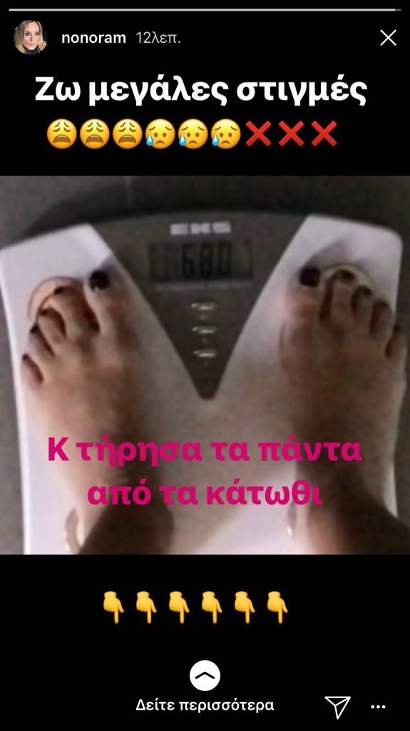 Σήμερα λοιπόν μοιράστηκε με τους fans της ένα στιγμιότυπο από μια -από ότι φαίνεται- καθημερινή της δραστηριότητα. Όπως και κάθε γυναίκα που λοιπόν που βλέπει το σώμα της να αλλάζει, έτσι και η Ελεονώρα ζυγίζεται σε καθημερινή βάση. Παρόλο που, όπως λέει, ακολουθεί πλήρως τους «κανόνες ζυγίσματος» (να ζυγίζεται κάθε μέρα την ίδια ώρα, πριν φάει, στην ίδια ζυγαριά κλπ) η ζυγαριά ανεβαίνει και αυτή την στιγμή λοιπόν δείχνει τα 68 κιλά δηλαδή έχει πάρει έξι κιλά μιας κι έχει δηλώσει πολλές φορές ότι το φυσιολογικό της βάρος είναι 62 κιλά. Εμείς βέβαια δε βρίσκουμε τίποτα κακό σ’ αυτό μιας και είναι απόλυτα φυσιολογικό να παίρνει συνεχώς κιλά, εφόσον είναι έγκυος. Υπομονή λοιπόν Ελεονώρα και με το καλό!