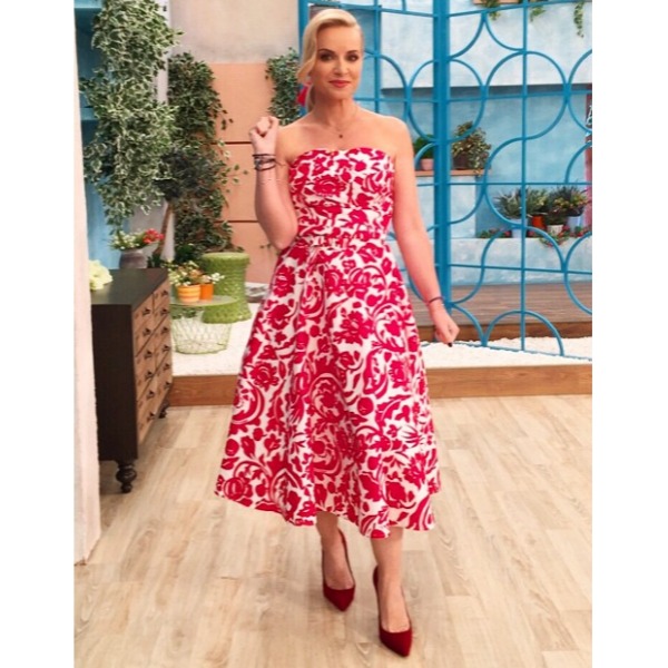 Έτσι και σήμερα την είδαμε με ένα υπέροχο φόρεμα με έντονο, κόκκινο print το οποίο ήταν σε πολύ θηλυκή γραμμή 1950s, που κατά την άποψή μας είναι το στιλ που της ταιριάζει περισσότερο από οτιδήποτε. Πρόκειται για ένα στράπλες φόρεμα Samantha Sung το οποίο η παρουσιάστρια επέλεξε να συνδυάσει με ψηλοτάκουνες γόβες, σε επίσης κόκκινο χρώμα, Mark Milan. Τα μαλλιά που χτένισε σε ρετρό στιλ επιμελήθηκε η Κική Πολιτάκη και το μακιγιάζ της η Έλσα Πρωτοψάλτη.