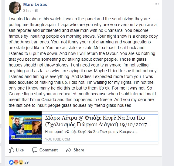 «Λιάγκα ποιος είσαι; Γιατί είσαι στην τηλεόραση; Είσαι σκ@τ@ δημοσιογράφος και ατάλαντος και ένας βαρετός άνθρωπος χωρίς χάρισμα. Έγινες διάσημος προσβάλλοντας ανθρώπους σε πρωινάδικα. Η βραδινή εκπομπή σου είναι μια φθηνή κόπια την αμερικανικής. Δεν είσαι αστείος, δεν είσαι γοητευτικός και οι ερωτήσεις σου είναι βαρετές όπως και εσύ… Έκατσα και σε άκουσα να με “σκοτώνεις”. Και τώρα θα επιστρέψω την χάρη. Είσαι τόσο τίποτα, που γίνεσαι κάτι επειδή μιλάς για άλλους. Αυτοί που μένουν σε γυάλινα σπίτια δεν πρέπει να πετάνε πέτρες. Δεν χρειάζομαι την τηλεόραση σου πλέον. Δεν πουλάω τίποτα και θα σου πω γιατί το λέω τώρα. Ίσως προσπάθησα να το πω αλλά κανείς δεν με άκουσε γιατί το timing είναι τα πάντα. Και, κυρίως, περιμένω περισσότερα από εσάς. Επίσης με κατηγορούν ότι όλο αυτό το έβγαλα από το κεφάλι μου, το δημιούργησα μόνη μου. Δεν ισχύει αυτό. Περιμένω για τα δικαιώματα μου. Δεν είμαι μόνη μου. Ξέρω πολλές στις οποίες έχει κάνει το ίδιο, αλλά εκείνες νομίζουν ότι είναι οκ! Γι’ αυτό Γιώργο Λιάγκα κλείσε το αμόρφωτο, απαίδευτο στόμα σου, γιατί, όταν είπα παγκόσμιο, εννοούσα ότι μένω στον Καναδά και αυτό έγινε στην Ελλάδα», έγραψε.