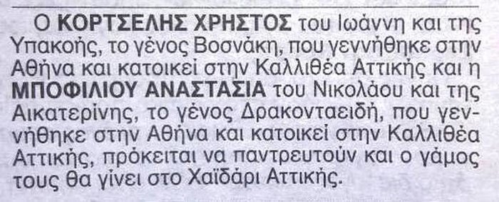 Η αναγγελία του γάμου δημοσιεύθηκε σε ημερήσια πολιτική εφημερίδα του Χαϊδαρίου: