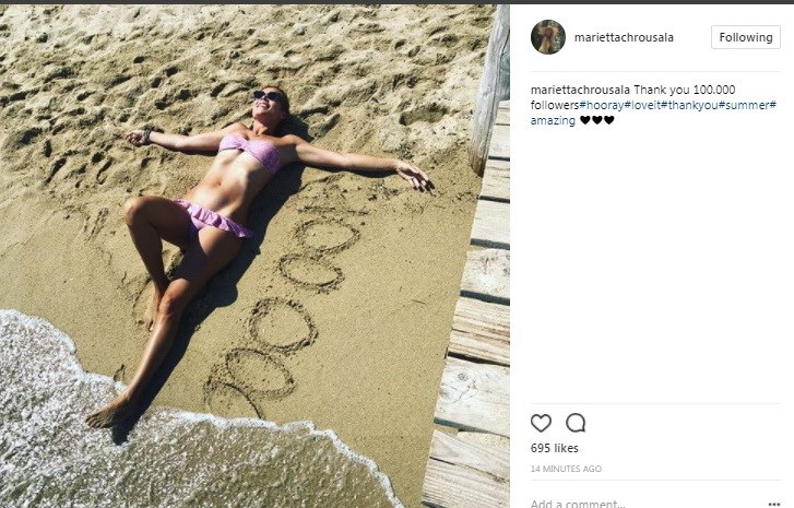 Η Μαριέττα συμπλήρωσε 100 χιλιάδες followers στο Instagram και για να τους ευχαριστήσει δημοσίευσε μια φωτογραφία της με μπικίνι. Όπως θα δείτε αν και βρίσκεται στον 5ο μήνα της εγκυμοσύνης της, η κοιλιά της έχει φουσκώσει ελάχιστα. Όπως ήταν αναμενόμενο τα likes “έπεσαν” βροχή!