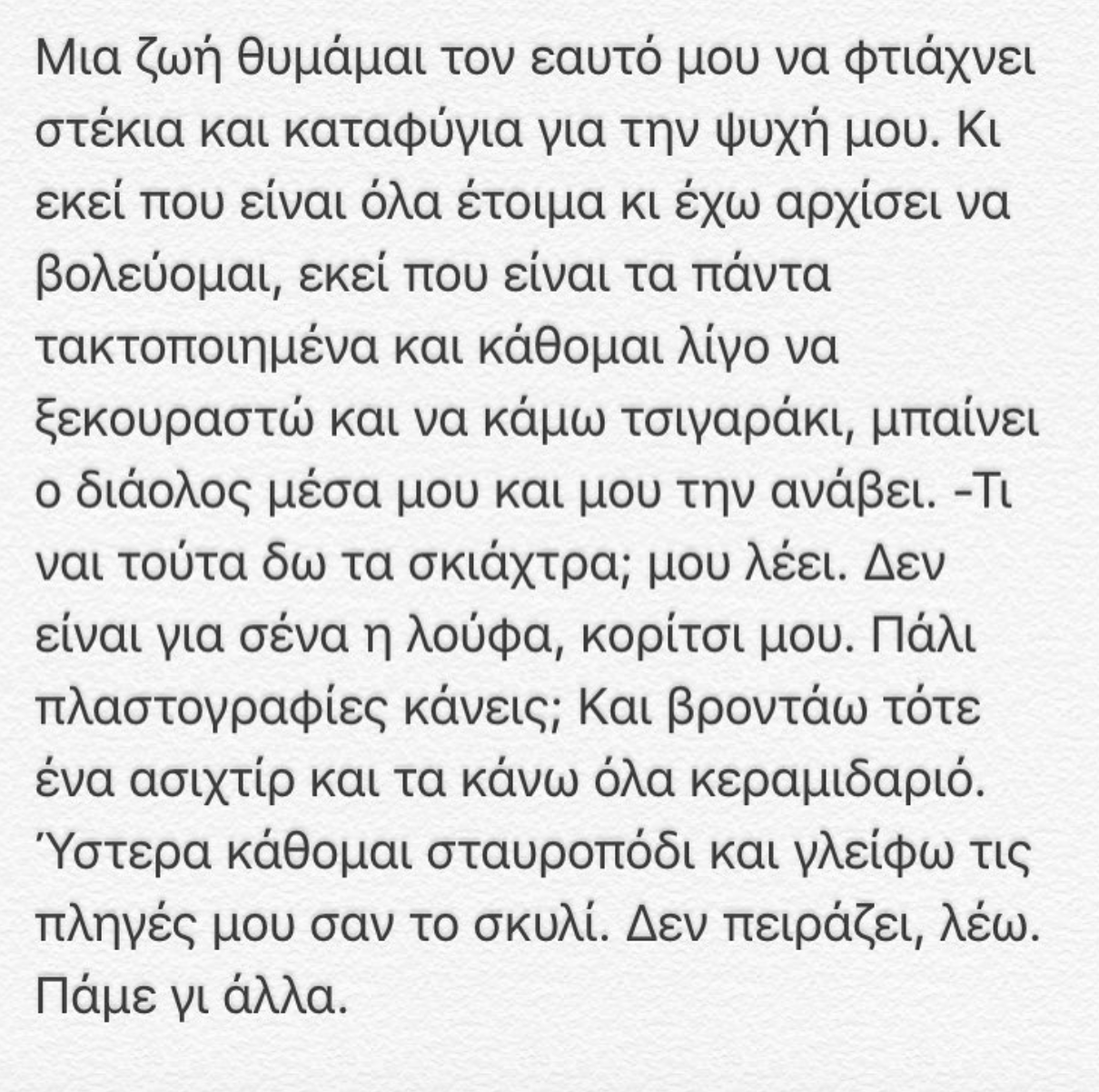Σύμφωνα με το Peoplegreece.com η Κατερίνα Καινούργιου διανύει μια σχετικά δύσκολη φάση στη ζωή της. Πρόσφατα έγινε γνωστός ο χωρισμός της από τον Βασίλη Σταθοκωστόπουλο. Χθες, επιβεβαιώθηκε το πρόωρο κόψιμο της εκπομπής που παρουσιάζει στην απογευματινή ζώνη του Alpha. Η παρουσιάστρια είναι αρκετά δραστήρια στο Instagram. Έχει υιοθετήσει μια συνήθεια και καθημερινά ανεβάζει διάφορες φράσεις, που συνήθως αφορούν τη ζωή. Αυτός ίσως, να είναι και ο τρόπος που επιλέγει για να εκφράσει τα συναισθήματα της. Χθες, μετά την δημοσιότητα που πήρε η είδηση για το τέλος της εκπομπής της, ανέβασε ένα στιγμιότυπο στα social media, στέλνοντας το δικό της μήνυμα. Συγκεκριμένα ανέβασε ένα απόσπασμα της Αλκυόνης Παπαδάκη, μοιράζοντας έτσι τις σκέψεις της με τους διαδικτυακούς της φίλους. Στην λεζάντα έγραψε: «Για τις φίλες μου…Νυχτερινές Ευαοσθησίες. Αλκυόνη Παπαδάκη. Καλό βράδυ σε όλους αγάπες μου»! kainourgiou instagram]]>