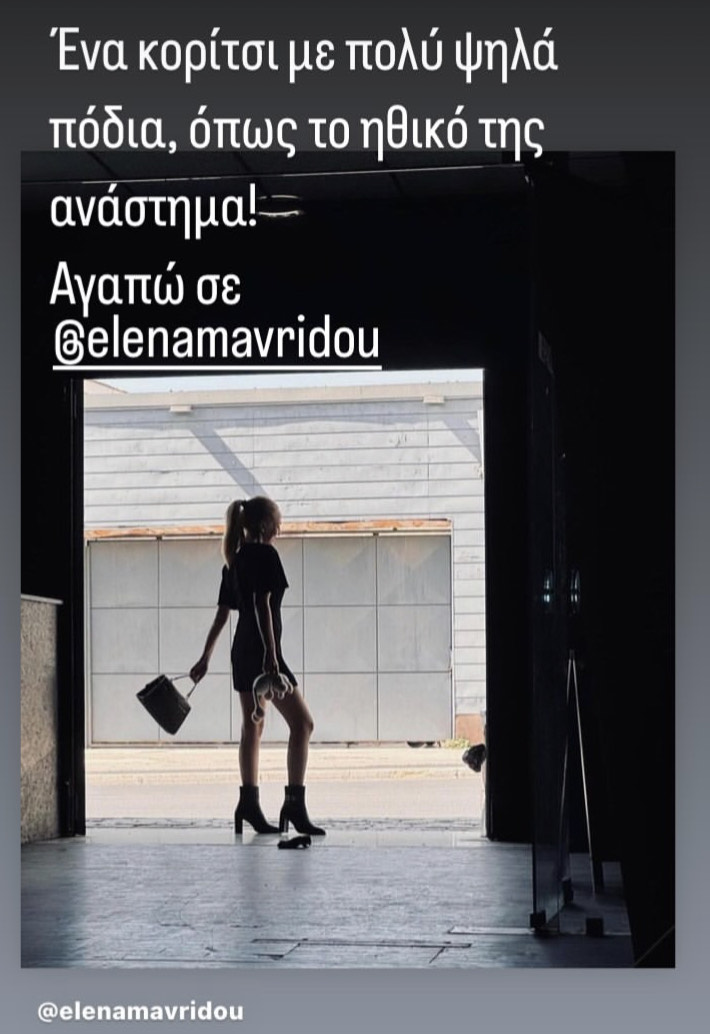 Το δικό της μήνυμα με μια ανάρτηση-καρφί θέλησε να δημοσιεύσει η πρώην σύζυγος του Βασίλη Μπισμπίκη. “‘Ενα κορίτσι με πολύ ψηλά πόδια, όπως το ηθικό της ανάστημα. Αγαπώ σε Ελενα Μαυρίδου” έγραψε η επιχειρηματίας, ανεβάζοντας μια φωτογραφία της ηθοποιού.