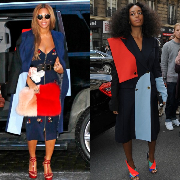 Ο κανόνας βέβαια που θέλει τις αδερφές να μοιράζονται πράγματα, ισχύει ακόμα και όταν αυτές είναι όπως είπαμε πολύ διάσημες και μπορούν να αγοράσουν πανάκριβα ρούχα και αξεσουάρ εις διπλούν. Πριν από λίγο καιρό, στην Εβδομάδα Μόδας της Νέας Υόρκης, η Beyoné πήγε στο show του Kanye West για την adidas και ιδιαίτερη εντύπωση έκανε ένα παλτό με έντονα χρώματα που φόρεσε και έφερε την υπογραφή του Harbison. Φαίνεται λοιπόν πως η Solange το είδε, της άρεσε και το ζήτησε από την αδερφή της για την Εβδομάδα Μόδας στο Παρίσι. Έτσι πριν από μερικές μέρες φωτογραφήθηκε με το ίδιο παλτό, το οποίο βέβαια φόρεσε λίγο διαφορετικά, καθώς το συνδύασε με πέδιλα Nicholas Kirkwood for Roksanda, δημιουργώντας ένα outfit με άλλο ύφος.