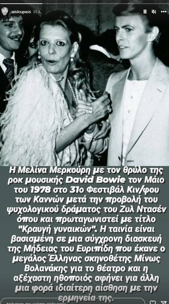 Ο δημοσιογράφος και συλλέκτης, Άρης Λουπάσης, δημοσίευσε στον προσωπικό του λογαριασμό στο Instagram μια σπάνια φωτογραφία από τη συνάντηση της Μελίνας Μερκούρη με τον David Bowie τον Μάιο του 1978 στο 31ο Φεστιβάλ Κινηματογράφου των Καννών.