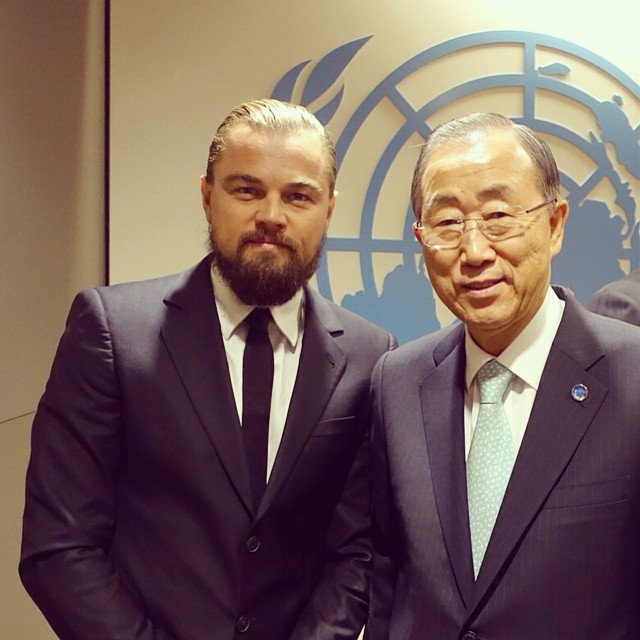 Στο στιγμιότυπο ο -για πάντα- υποψήφιος για Όσκαρ ηθοποιός, ποζάρει με τον γενικό γραμματέα των Ηνωμένων Εθνών, Ban-Ki Moon, και τη φωτογραφία σχολίασε ο ίδιος ως εξής: ” Σήμερα έχω το προνόμιο να μιλήσω στη Διάσκεψη Κορυφής των Ηνωμένων Εθνών, όπου οι ηγέτες θα ανακοινώσουν τα θαρραλέα βήματα που θα πάρουν για την αντιμετώπιση της κλιματικής αλλαγής”.