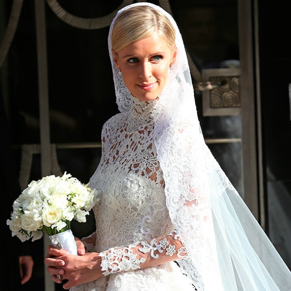 Με σεμνό ντεκολτέ, μακριά μανίκια από δαντέλα, η Nicky ήταν πραγματικά μία παραδοσιακή chic νύφη, η οποία ολοκλήρωσε το look με ένα εντυπωσιακό μακρύ πέπλο.