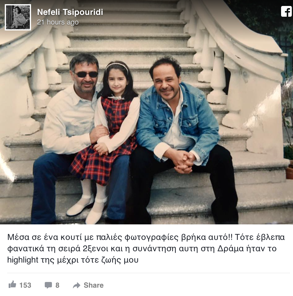 Μια σπάνια φωτογραφία που δημοσιεύτηκε στο Facebook χθες, μας γύρισε χρόνια πίσω. Συγκεκριμένα, η σκηνοθέτης και ηθοποιός Νεφέλη Τσιπουρίδη, ανάρτησε στο προφίλ της ένα στιγμιότυπο που την δείχνει μικρούλα να ποζάρει στο πλευρό του Νίκου Σεργιανόπουλου και του Αλέξανδρου Ρήγα. Στην λεζάντα νιώθοντας νοσταλγία, έγραψε: «Μέσα σε ένα κουτί με παλιές φωτογραφίες βρήκα αυτό! Τότε έβλεπα φανατικά τη σειρά “Δύο Ξένοι” και η συνάντηση αυτή στη Δράμα ήταν το highlight της μέχρι τότε ζωής μου».