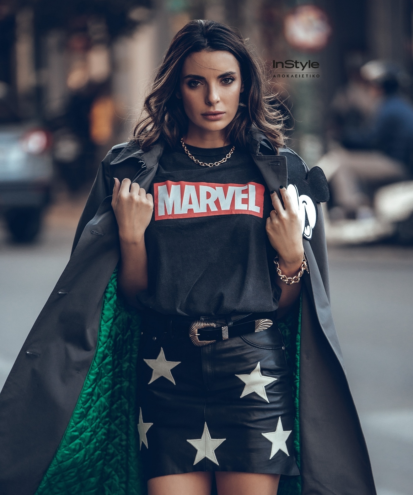 Καμπαρντίνα United Colors of Benetton, gr.benetton.com. Τοπ Pull & Bear, pullandbear.com. Φούστα One Teaspoon, Linea Imports. Ζώνη Zara, zara.com. Κολιέ και βραχιόλι H&M, hm.com. Styling: Πέννυ Ιωαννίδου.