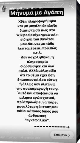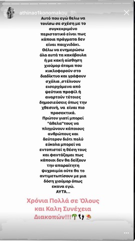 Η Αθηνά Οικονομάκου βλέποντας τη μακάβρια αυτή φάρσα, αντέδρασε μέσω Insta Stories τονίζοντας πως καλό θα ήταν να σταματήσουν τέτοιες κινήσεις από άτομα με “χιούμορ” γιατί ενδεχομένως κάποιος άλλος να μην τον αντιμετωπίσει τόσο ψύχραιμα όσο εκείνη.