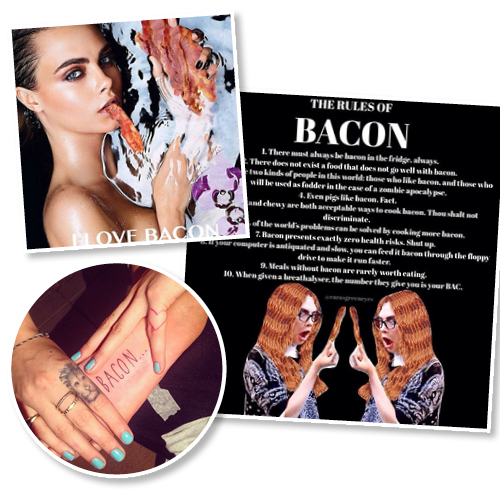 Η νεαρή αγαπάει το μπέικον τόσο πολύ που θέλησε να το χαράξει για πάντα στο κορμί της. Δεν είναι λίγες οι φωτογραφίες που έχει ανεβάσει με το προϊόν-όπως αυτές που βλέπετε- ενώ σε συνεντεύξεις της δηλώνει πάντα πως το μυστικό της ομορφιάς της, οφείλεται στην κατανάλωσή του.