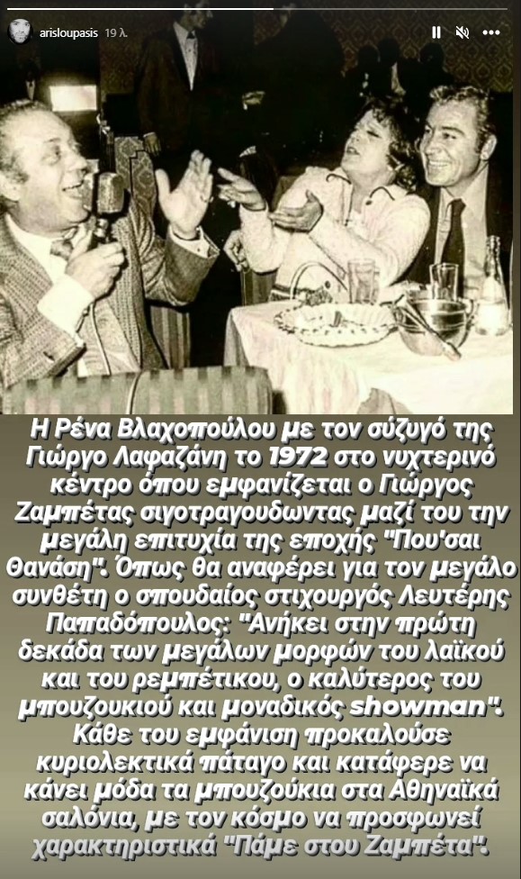Ο δημοσιογράφος και συλλέκτης, Άρης Λουπάσης, δημοσίευσε στον προσωπικό του λογαριασμό στο Instagram μια σπάνια φωτογραφία, στην οποία η Ρένα Βλαχοπούλου και ο σύζυγός της διασκεδάζουν στο νυχτερινό κέντρο, όπου εμφανίζεται ο Γιώργος Ζαμπέτας το 1972.
