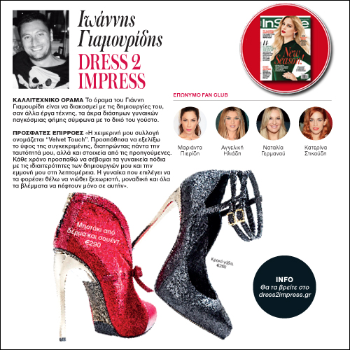 Πρόσφατες Επιρροές «Η χειμερινή ου συλλογή ονομάζεται “Velvet Touch”. Προσπάθησα να εξελίξω το ύφος της συγκεκριμένης, διατηρώντας πάντα την ταυτότητά μου, αλλά και στοιχεία από τις προηγούμενες. Κάθε χρόνο προσπαθώ να σέβομαι τα γυναικεία πόδια με τις ιδιαιτερότητες τω δημιουργιών μου και την εμμονή μου στη λεπτομέρεια. Η γυναίκα που επιλέγει να τα φορέσει θέλω να νιώθει ξεχωριστή, μοναδική και όλα τα βλέμματα να πέφτουν μόνο σε αυτην».