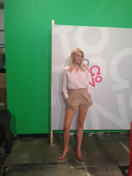 Η παρουσιάστρια επέλεξε μεταξωτό πουκάμισο και μάλλινο σορτς σε αποχρώσεις του μπεζ που ανήκουν και τα δύο στην εταιρία Dondup Salt Water. Η Σάσα ολοκλήρωσε το look με nude γόβες ΝΑΚ και σκουλαρίκια Jasmine by Georgina.