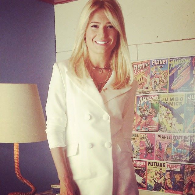 Η ξανθιά παρουσιάστρια σήμερα λοιπόν, για την πρώτη της εμφάνισης επέλεξε ένα πολύ chic tuxedo dress από την εταιρεία BSB. Το πολύ sexy και ταυτόχρονα classy σύνολό της ολοκλήρωσε πολύ σωστά με nude γόβες του Οίκου Casadei από τα καταστήματα Καλογήρου.