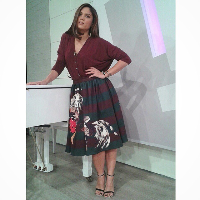 Το σημερινό της look στην εκπομπή Πρω1νό στον Αντ1 αποτελούνταν από μία ριγέ φούστα σε 50’ς γραμμή -με ιδιαίτερο print- και μία μπορντό μπλούζα-ζακέτα όλα από τη φίρμα Manolo.