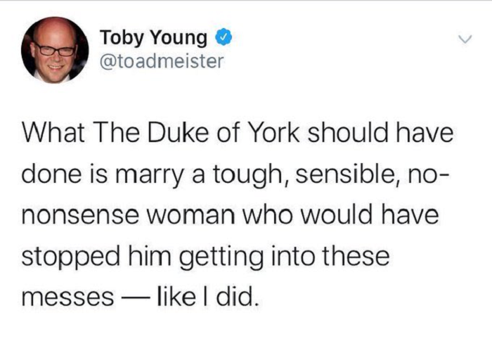 Τις αρνητικές αντιδράσεις των followers του στο Twitter προκάλεσε ο δημοσιογράφος Toby Young με ένα προκλητικό σχόλιο που έκανε για την υπόθεση του πρίγκιπα Andrew –ο οποίος έχει κατηγορηθεί ότι εμπλέκεται στο σκάνδαλο Epstein.
