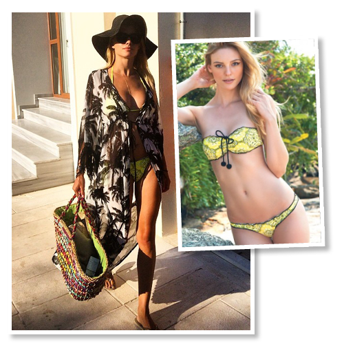 Το σε έντονο κίτρινο χρώμα μπικίνι με το ασπρόμαυρο σχέδιο που μπορείτε να το βρείτε πατώντας εδώ, η Ευαγγελία συνδύασε με κομψό καφτάνι Viva Fashion Boutique, ψάθινη μεγάλη τσάντα, μαύρο καπέλο και καφέ flip flops.