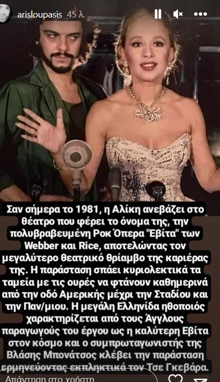 Σαν σήμερα το 1981 η Αλίκη Βουγιουκλάκη ανέβασε στο θέατρο που έφερε το όνομά της την πολυβραβευμένη Ροκ Όπερα “Εβίτα”. Ο δημοσιογράφος και συλλέκτης, Άρης Λουπάσης ανέβασε στον προσωπικό του λογαριασμό στο Instagram μια φωτογραφία, στην οποία η αξέχαστη ηθοποιός ερμηνεύει την Εβίτα έχοντας στο πλευρό της στον ρόλο του “Τσε Γκεβάρα”, τον Βλάση Μπονάτσο.
