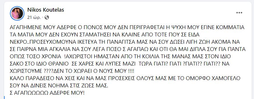 Τη θλιβερή είδηση έκανε γνωστή ο δίδυμος αδελφός του Νίκος, με μια συγκλονιστική ανάρτηση στον λογαριασμό του στο facebook.